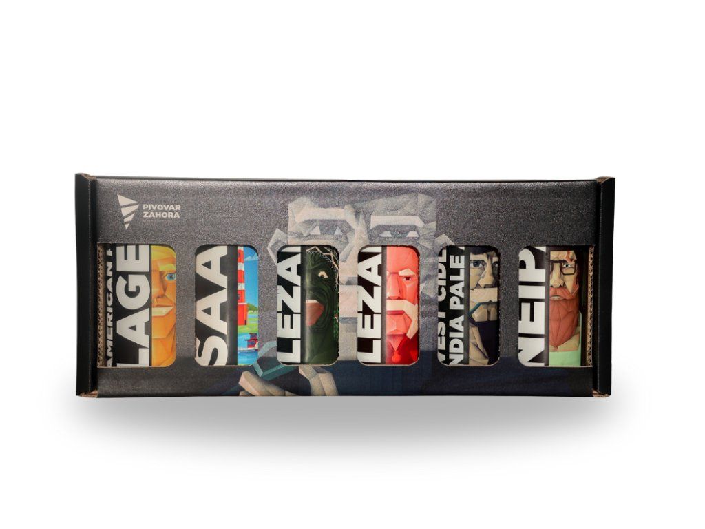 Dárkové kartonové balení s potiskem obsahuje šest 0,5 l plechovek - americkou desítku, českou jedenáctku, novozélandskou jedenáctku, vídeňský ležák, West Cidlina IPA a NEIPA.